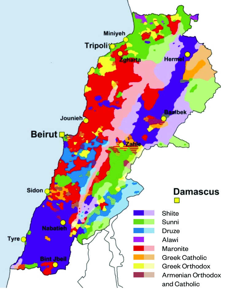 The map above shows the traditional sectarian divide in Lebanon. The major groups are the Shiites (27%), Sunnis (27%) and Maronites (21%).